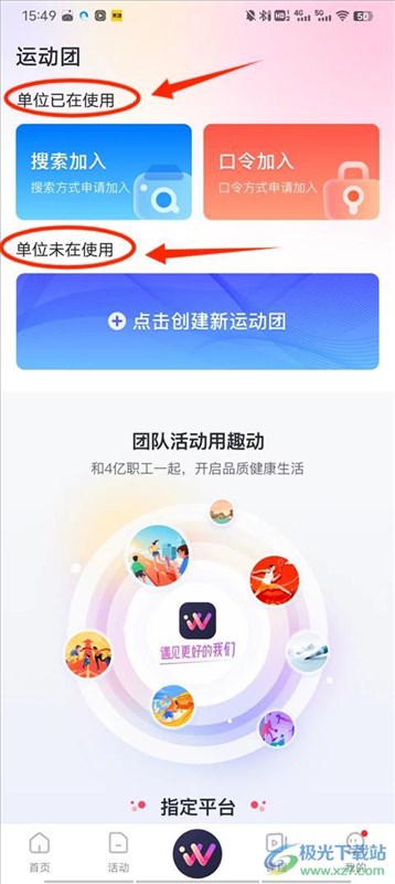 2、在“运动团”页面,展示了单位已使用和未使用的团队;