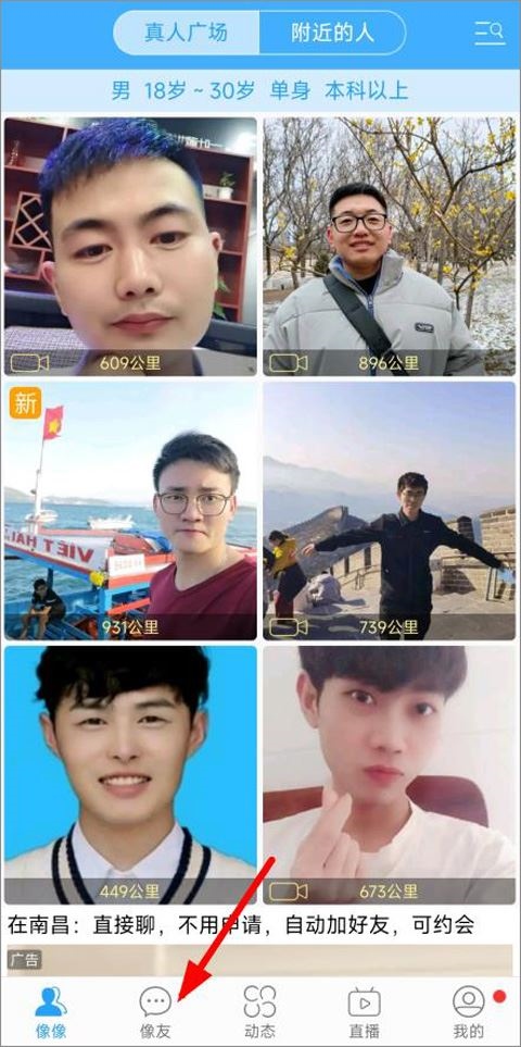 1、用户打开像像交友平台,登录后进入首页,首页会根据用户性别推荐交友类型,用户可以选择与感兴趣的人聊天,点击添加好友。